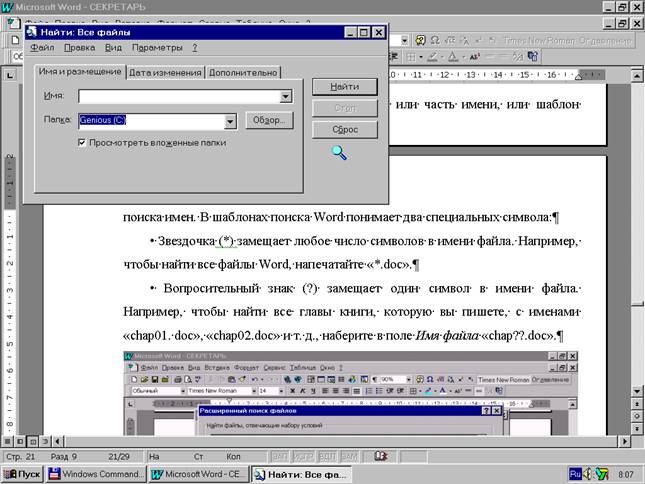 Вы можете также производить поиск без использования специальных символов. Для этого достаточно набрать часть имени - любую последовательность символов, которые содержатся в имени. Например, введя “Име”, вы сможете найти файлы с именами “Именины. dос”, “Пример 1.doc” и “Пример2. d ос”.