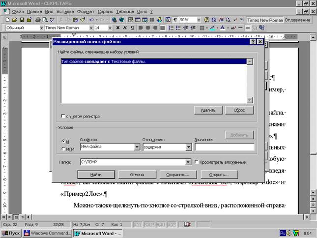 Однако нередко бывает так, что вы не можете припомнить каких-либо свойств документа, который вам нужен. Для таких непростых случаев поиска файлов пользуйтесь диалоговым окном Отбор документов.