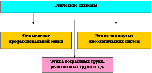 Этика стала накапливать практический материал и осмысливать возникновение, развитие, основные механизмы частных, специфических, особенных этических систем (Рисунок 3).
