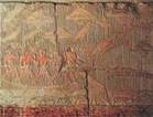 | Рельефы росписи | Наряду с плоским, почти не вы ступающим над поверхностью стены рельефом возник, а позже широко распространился так называемый углублённый рельеф: врезанное изображение заполнялось краской, и появлялся цветной силуэт. Рельефы развёртывались один над другим; каждый представлял собой повествовательный ряд. Фигуры располагались вереницами — в схожих позах, с одинаковыми жестами; на светлом фоне чётко выделялись кирпично-красные тела мужчин и жёлтые — женщин. Изображались сельские работы, труд ремесленников, охота, рыбная лов ля, процессии носителей даров, погребальные шествия, загробныепиршества, строительство лодок,игры детей и многие другие сцены. |