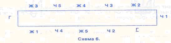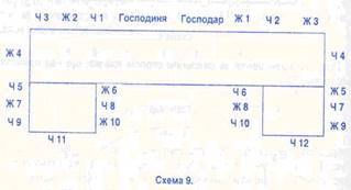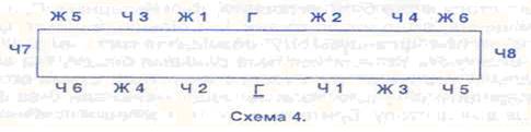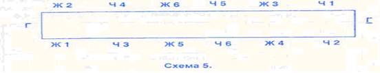 Однак, при такому розміщенні чергування чоловік-жінка можливе лише тоді, коли за столом сидить 6, 10, 14, 18, 22 тощо особи. Якщо учасників прийому 8, 12, 16, 20 тощо (число, кратне чотирьом) для чергування чоловік-жінка необхідно змістити господиню на одне місце (схема 6).