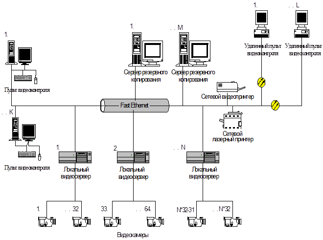 Видеосигналы от телевизионных камер, установленных в локальных зонах наблюдения, поступают на локальные видео серверы, к каждому локальному видео серверу подключается от 1 до32 телекамер. Локальный видеосервер осуществляет сбор, обработку и накопления видеоинформации.