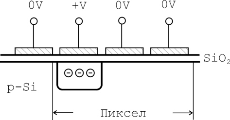 На рисунке показана структура одного элемента, линейного трехфазного ПЗС в режиме накопления. Структура состоит из слоя кремния р-типа (подложка), изолирующего слоя двуокиси кремния и набора пластин-электродов. Один из электродов смещен более положительно, чем остальные два, и именно под ним происходит накопление заряда. Полупроводник р-типа, получают добавлением (легирование) к кристаллу кремния акцепторных примесей, например, атомов бора. Акцепторная примесь создает в кристалле полупроводника свободные положительно заряженные носители — дырки. Дырки в полупроводнике р-типа являются основными носителями заряда, свободных электронов там очень мало. Если теперь подать небольшой положительный потенциал на один из электродов ячейки трехфазного ПЗС, а два других электрода оставить под нулевым потенциалом относительно подложки, то под положительно смещенным электродом образуется область, обедненная основными носителями - дырками. Они будут оттеснены вглубь кристалла. На языке энергетических диаграмм это означает, что под электродом формируется потенциальная яма.