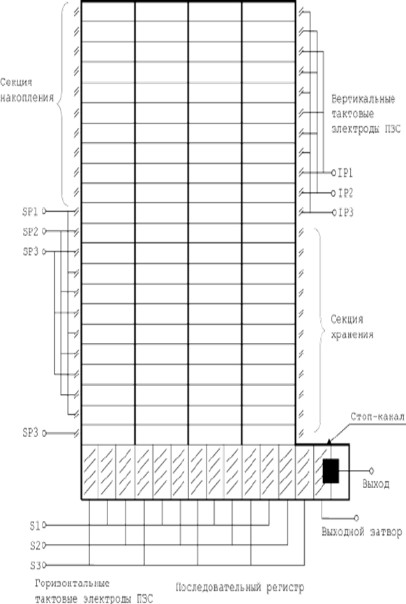Большинство типов ПЗС-матриц, изготавливаемых на промышленной основе, ориентированы на применение в телевидении, и это находит отражение на их внутренней структуре. Как правило, такие матрицы состоят из двух идентичных областей - области накопления и области хранения.