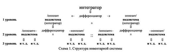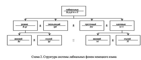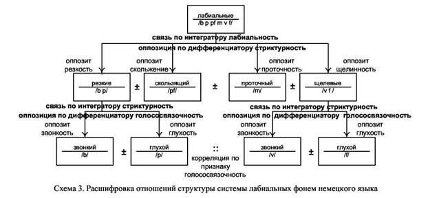 Как отмечает Л. Н. Черкасов, «когда после идентификации фонем фонолог начинает исследовать их инвентарную систему, он, пользуясь методом обобщения, последовательно изучает связи (от широких к узким) и оппозиции фонем, постепенно открывая для себя структуру данной фонемной системы» [14. С. 20]. В соответствии с положениями теории лингвистических систем структуру инвентарной системы следует анализировать, выделяя общие отношения по сходству в направлении по убывающей, выявляя на каждой ступени анализа преобладающий тип связи (интегратор) и однородные, но разнотипные признаки (оппозиты дифференциатора). Анализ считается завершённым после того, как выявляются отношения по всем интеграторам и дифференциаторам. Результаты анализа представляются в виде графической схемы (схема 1). В качестве конкретного примера подобной структуры приведём структуру подсистемы лабиальных фонем немецкого языка (схема 2). Расшифровка всех структурообразующих отношений этой системы представлена на схеме 3.