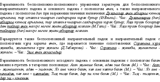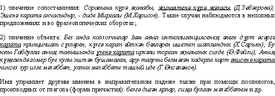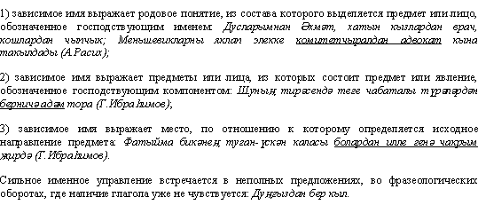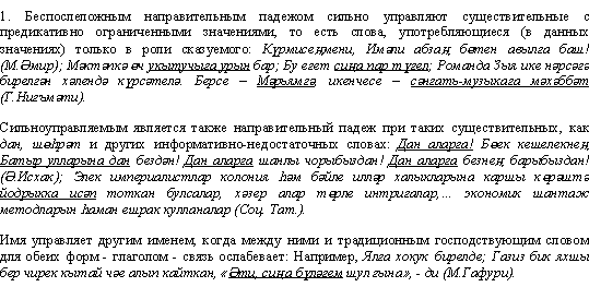 Таким образом, именное управление, как и глагольное, в татарском языке может быть сильным и слабым, послеложным и беспослеложным. В некоторых этих случаях представляется также и вариативное управление. Помимо сходств этих двух видов управления, существуют, естественно, и различия между ними, которые состоят в следующем. Управление присуще глаголам по их природе, и, по мнению А.Аблакова, употребление зависимого компонента в определенной падежной форме вызывается тем или иным лексическим значением стержневого компонента [2, с. 38]. Со своей стороны хотелось бы заметить, что употребление зависимого компонента связано не только лексическим, но и грамматическим значением главного слова.