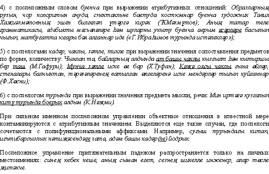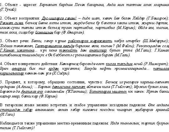 В татарском языке, как и в других тюркских языках, определяемое слово управляет не только косвенным, но и основным падежом (с послелогом или без него), выступающим в значении косвенных падежей.