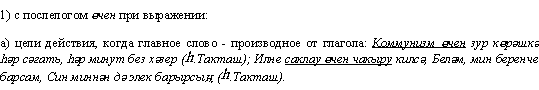 Словосочетания с именным управлением играют значительную роль в языке и требуют специального исследования. “Изучение фактов раннего периода развития языка свидетельствуют о том, что имена не могли самостоятельно управлять каким-либо словом, - считает А.Аблаков. - В памятниках орхоно-енисейской письменности имена управляют другими словами лишь в сочетании со вспомогательным глаголом. Случаев самостоятельного именного управления в этот период не отмечается” [1, с. 47].