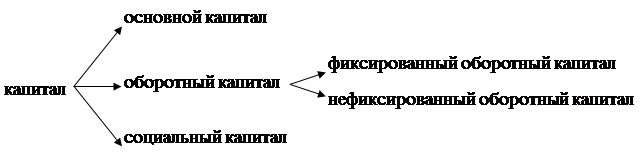 Термин капитал является гиперонимом по отношению к терминологическим сочетаниям, содержащим семантические конкретизаторы родового понятия. Один из них, в свою очередь, является родовым по отношению к видовым второй ступени: оборотный капитал — фиксированный оборотный капитал, нефиксированный оборотный капитал. Родо-видовые связи терминов рассматриваемой ЛТГ представляют собой многоступенчатые парадигматические отношения.