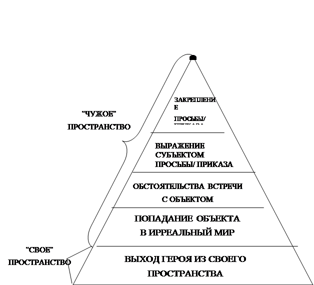 В концептуализированном пространстве исследованных кубанских заговоров нами выделено 5 составляющих: 1) выход героя из своего пространства, 2) попадание объекта в ирреальный мир, 3) обстоятельства встречи с объектом, 4) выражение субъектом просьбы или приказа, 5) закрепление просьбы или требования. Мы предлагаем свое видение реализации строения концептуального пространства заговоров Кубани, которое раскрывает путь героя от начала до конца, прохождение которого ведет к получению желаемого.