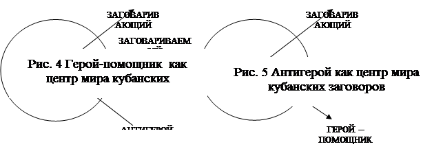 5. Главным составляющим концептуального пространства является языковая личность, представленная образами заговаривающего, заговариваемого, мифологического героя-помощника и мифологического антигероя: каждый из них может являться «центром мира» концептуального пространства кубанских заговоров.