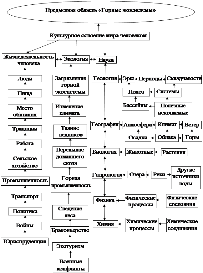 Когнитивная модель предметной области «Горные экосистемы» имеет комплексный характер. Ядром модели выступает фрейм «Экология», который включает определенные блоки знания – вложенные фреймы (жизнедеятельность человека, геология, география, биология, гидрология, физика, химия). Суть когнитивной модели состоит в построении блоков организации знания вокруг экоцентра (сохранение и поддержание экосистемы). В лингвистическом аспекте ей соответствует тезаурус.