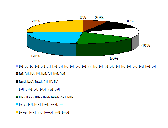 Все звуки адыгейского языка отражены в диаграмме №1. Последовательность их определяется степенью сложности их произношения русскими респондентами.