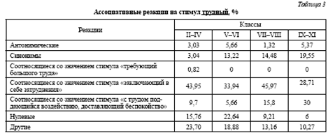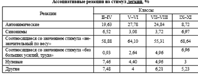 Доля антонимических реакций сравнительно небольшая и варьирует от 3 до 5%. Основным антонимом является слово «легкий». Испытуемые очень много приводят реакций-синонимов на стимул трудный. Доля синонимических реакций к старшим классам возрастает до 19, 55%.