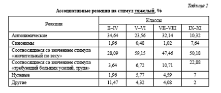 Как видно из приведенной табл. 1, доля антонимических реакций уменьшается к XI классу за счет возрастания доли реакций, соотносящихся со значением стимула «незначительный по весу» и «без больших усилий, труда». Реакции, соотносящиеся со значением стимула «незначительный по весу», преобладают во всех классах, что говорит о том, что данное значение является основным и первым, которое усваивается еще в начальной школе. Другое же значение является производным и более сложным для усвоения.