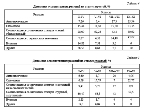 Составленные таблицы (1–5) демонстрируют динамику изменения доли реакций-антонимов и реакций-синонимов. Эти изменения происходят по-разному, поскольку динамика связана со значением исследуемых стимулов.