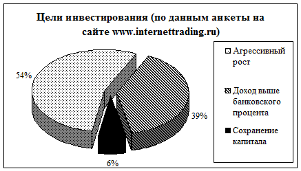 Интернет-трейдинг дает реальный шанс разбогатеть за относительно короткий промежуток времени. Другое дело, что этот шанс носит вероятностный характер, и надо отдавать себе в этом отчет. Но этот шанс более вероятен, чем, например, лотерея или казино и потенциально быстрее достижим, чем накопления от работы по найму. Надо думать, что большинство людей прекрасно это понимают, о чем свидетельствует распределение ответов на вопрос о целях инвестирования, которое отдает подавляющее предпочтение агрессивному росту и доходу выше банковского процента.