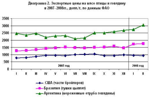 Рост контрактных цен на мясо птицы в прошедшем году в определенной мере вызван повышением, по сравнению с предыдущим годом, цен на мировом рынке (диаграмма 2).