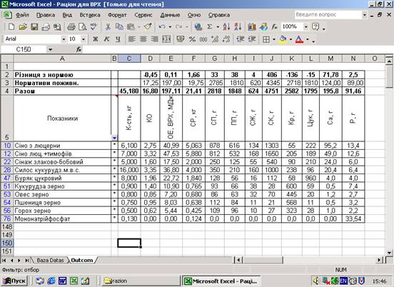 За перемінні прийняті корма, що є в господарстві, а також загальний вміст кормових одиниць у раціоні.