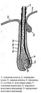 В дерме залегают корневые влагалища волос, потовые и сальные железы, пигментные клетки. Сальные железы по строению относятся к альвеолярным, а по характеру деятельности - к голокриновым, т.е. к таким, у которых секретирующие клетки перерождаются в секрет. Секрет сальных желез - кожный жир - обволакивает волос, защищает его от неблагоприятных воздействий внешней среды. Количество, форма и размеры сальных желез связаны со степенью развития волосяных корней и густотой их расположения. Толстые корни имеют две крупные железы, тонкие - одна, а у части пуховых волокон железы отсутствуют вообще. Секрет сальных желез придает мягкость и усиливает блеск волос. Потовые железы участвуют в водно - солевом обмене.