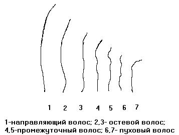 Длина верхнего участка наиболее стабильна по площади шкурки и составляет - 2-3 мм; длина среднего участка имеет наибольшее значение в области загривка 8-12 мм и наименьшее в областях огузка и черева 3-6 мм.; длина нижнего участка составляет 7-12 мм, максимального значения достигает по линии хребта.