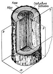 Рисунок 1.2 – Основные части ствола и главные разрезы: П – поперечный, Р – радиальный, Т – тангенциальный