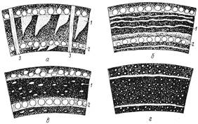 Годичные слои, ранняя и поздняя древесина. На поперечном разрезе видны концентрические слои, расположенные вокруг сердцевины. Эти образования представляют собой ежегодный прирост древесины. Называются они годичными слоями. На радиальном разрезе годичные слои имеют вид продольных полос, на тангентальном – извилистых линий (рисунок 1.3). годичные слои нарастают ежегодно от центра к периферии и самым молодым слоем является наружный. По числу годичных слоев на торцевом разрезе на комле можно определить возраст дерева.