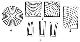 Пиломатериалы общего назначения по форме и размерам поперечного сечения делят на доски – если ширина вдвое больше толщины (рисунок 3.1, г,д,е,ж), бруски – если ширина меньше двойной толщины (рисунок 3.1,з) и брусья (у хвойных пиломатериалов) – если ширина и толщина более 100 мм. По числу пропиленных сторон брусья (рисунок 3.1,а,б,в) могут быть двухкантнами, трехкантными и четырехкантными.