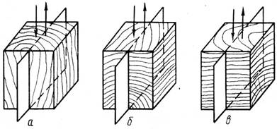 Ствол изучают на трех главных разрезах: поперечном, и двух продольных – радиальном и тангенциальном (рисунок 1.2). Плоскость поперечного, или торцевого, разреза перпендикулярна оси ствола. Плоскость одного из продольных разрезов проходит через сердцевину ствола по радиусу торца – радиальный разрез, плоскость другого разреза – тангенциального – направлена по касательной к окружностям, образованным слоями годичного прироста. На поперечном разрезе можно указать радиальные и тангенциальные направления, а на продольных разрезах направления вдоль волокон и радиальное или тангенциальное.