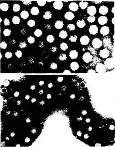 Внизу-частицы вируса блютанга из градиента CsCl, рН 6,0. Показаны детали поверхности. внутренний капсид (диаметр 55 нм) состоит из единственного слоя регулярно упакованных морфологических единиц или капсомеров (÷125000)