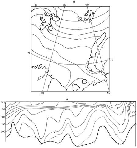 Рис. Температура воды в Баренцевом море на поверхности (а) и на разрезе по Кольскому меридиану (б)