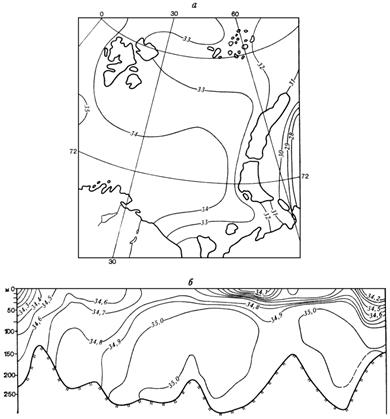 Распределение температуры по вертикали в значительной мере зависит от распространения теплых атлантических вод, от зимнего охлаждения, распространяющегося на значительную глубину, и от рельефа дна (см. рис., б). В связи с этим изменение температуры воды с глубиной происходит неодинаково в разных районах моря. В юго-западной части, наиболее подверженной влиянию атлантических вод, температура плавно и в небольших пределах понижается с глубиной до дна.