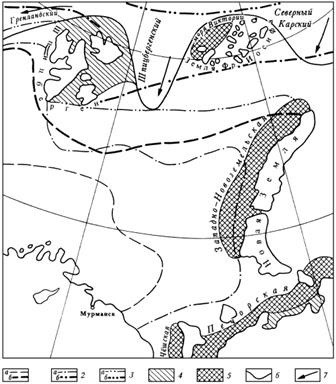 Рис. Границы распространения льдов в Баренцевом море: 1 - максимальная в феврале (а) и августе (б); 2 - средняя в феврале (а) и августе (б); 3 - минимальная в феврале (а) и августе (б); 4 - припай; 5 - полыньи; 6 - граница отрогов ледяных массивов; 7 - преобладающее направление дрейфа