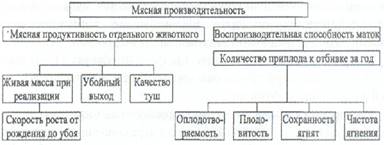 Основными показателями мясной продуктивности овец являются: предубойная живая масса, масса туши, масса внутреннего жира, убойная масса, убойный выход, категория упитанности овец и туши, сортовой и морфологический состав туш, пищевая ценность мяса и др.