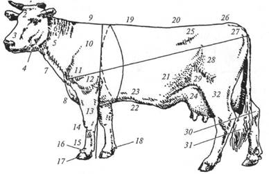1 — затылочный гребень; 2 — лоб; 3 — морда; 4 — нижняя челюсть; 5 — шея; 6 — загривок; 7 — подгрудок; 8 — грудинка (челышко); 9 — холка; 10 — лопатка; 11 — плечелопаточное сочленение; 12 — локоть; 13 — предплечье; 14 — колено (запястье); 15 — берцовые кости (пясть); 16 — бабка (путо); 17 — копыто; 18 — копытце; 19 — спина; 20 — поясница; 21 — щуп; 22 — молочные колодцы; 23 — молочные вены; 24—вымя; 25 — маклоки; 26— круп; 27 — седалищные бугры; 28 — бедро; 29 — коленная чашка; 30 — скакательный сустав; 31 — кисть хвоста;