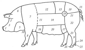 1 — рыльце (хоботок); 2 — глаза; 3 — рыло; 4 — уши; 5 — ганаши; б — шея; 7 — плечи; 8 — передняя нога; 9 — задняя нога; 10 — грудь; 11 — подпруга; 12 — спина; 13 — поясница; 14— бока (ребро); 15 — хвост; 16— передний пах; 17 — задний пах; 18 — подвздох; 19 — круп; 20 — брюшко; 21 — окорок; 22 — заднее колено; 23 — пятка (лодыжка); 24 — путо; 25 —