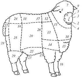1 — морда; 2 — рот; 3 — ноздри; 4 — губы; 5 — нос; 6 — щека; 7 — лоб; 8 — глаза; 9 — уши; 10— шея; 11 — подплечная борозда; 72— холка; 13— плечи; 14— грудь; 15— чёлышко; 16— передние ноги; 17— спина; 18— поясница; 19— подвздохи; 20 — ребра; 21 — передний пах; 22 — брюхо; 23 — задний пах; 24 — круп; 25 — окорочок: 26 — подпруга; 27— корень хвоста; 28 — штаны; 29 — задние ноги