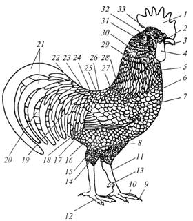 1 — гребень; 2 — ноздри; 3 — клюв; 4 — сережки; 5 — передние шейные перья; 6 — грудь; 7 — плечевые перья крыла; 8 — перья голени; 9 — ноготь; 10 — палец; 11 — плюсна; 12 — подошва; 13 — шпора; 14 — пятка; 15 — кроющие перья крыла; 16 — маховые перья первого порядка; 17 — хлуп, кочень; 18 — маховые перья второго порядка; 19 — малые косицы; 20 — рулевые перья; 21 — большие косицы; 22, 23 — кроющие перья хвоста; 25— кроющие перья поясницы; 26— спина; 27 — кроющие перья плеча; 28 — основание шеи; 29— кроющие перья шеи; 30 — шея; 31 — ушная мочка; 32 — ухо;