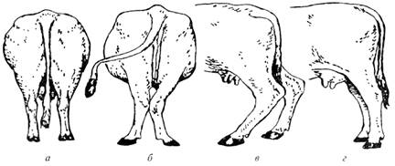 К признакам здорового телосложения относятся общая пропорциональность, глубокая и широкая грудь, крепкое и хорошо развитое туловище, хорошая оброслость тела, прочный блестящий волос, неломкий гладкий рог, хорошо выраженные половые признаки. У крупного рогатого скота значение имеет оценка коров по форме вымени и его пригодности к машинному доению. Различают ваннообразную, чашеобразную, округлую и козью формы вымени Экстерьер коров оценивают обычно после первого и третьего отелов. Быков оценивают по экстерьеру ежегодно до пятилетнего возраста.