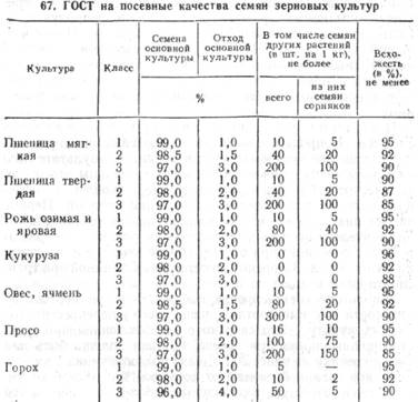 Семена, отвечающие требованиям ГОСТа, называются кондиционными . На семенных участках высевают семена 1-го класса, на товарных посевах — 1-го и 2-го. В виде исключения на посев могут использоваться семена 3-го класса с разрешения Министерства сельского хозяйства.
