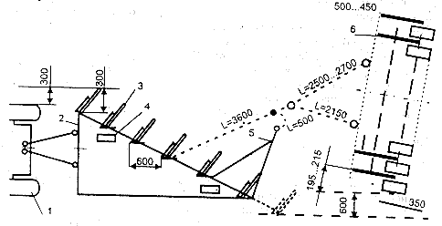 Рис 15 Схема присоединения приспособления П В Р-2,3 к 6.. 7-корпусному плугу-лущильнику для пахоты на глубину 12 .22 см 1- трактор, 2- плуг-лущильщик; 3 -корпус туга. 4- опорное колесо, 5 -прицепка для борон, 6- приспособление