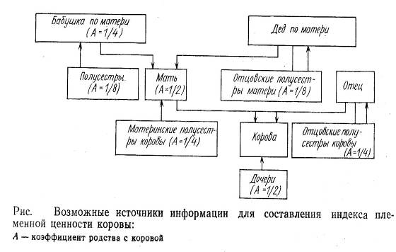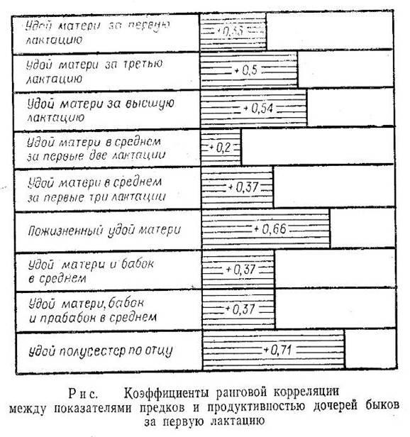 Привлечение информации о продуктивных качествах бабок и прабабок также незначительно повышает надежность отбора ремонтных быков по родословной. Таким образом, оценка производителей по удою ближайших женских предков может быть в отдельных случаях только ориентировочной. Однако в системе селекционной работы нельзя совсем исключить легко осуществимый и доступный каждому специалисту отбор по родословной, так как он останется важнейшим звеном в качестве критерия предварительной оценки быков-производителей перед проверкой их по качеству потомства.