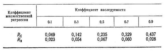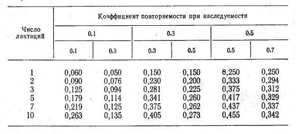 В табл. 1 приведены коэффициенты регрессии племенной ценности пробанда по фенотипу матери для разных значений наследуемости, повторяемости и числа лактации матери.