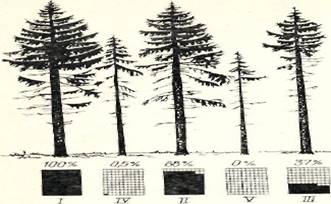 Отсутствие до смыкания крон конкуренции у деревьев, более позднее наступление их дифференциации.