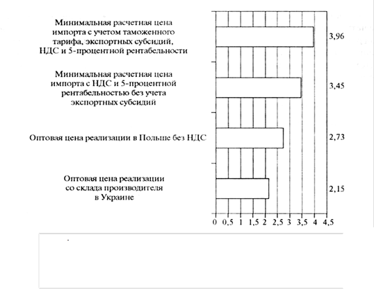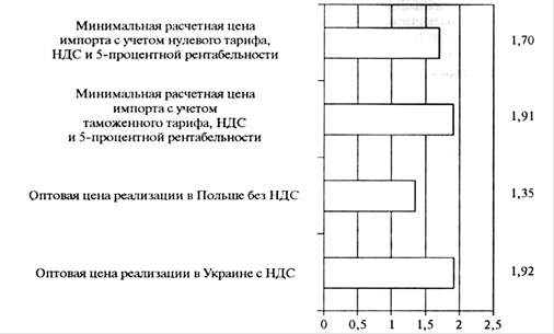 В течение анализируемого периода АСР Польши субсидировало экспорт говядины из бюджета ЕС в размере 15 евро за 100 кг. Если принять во внимание, что, поданным АСР Польши, в январе 2010 г. на внутреннем рынке этой страны оптовые цены реализации говядины (четверть туши) мясоперерабатывающими предприятиями составили 11,13 польского злотого за 1 кг (без НДС), то с учетом экспортных субсидий, действующей пошлины (15%), НДС и минимальной 5-процентной рентабельности трейдеров цена импортного мяса должна была бы составить, как минимум, 3,96 евро за 1 кг. При условии нулевой ставки импортной пошлины и отмены экспортной пошлины минимальная расчетная цена польской говядины на внутреннем рынке Украины достигла бы 3,45 евро за 1 кг, что на 60% превышает цену отечественного производителя.