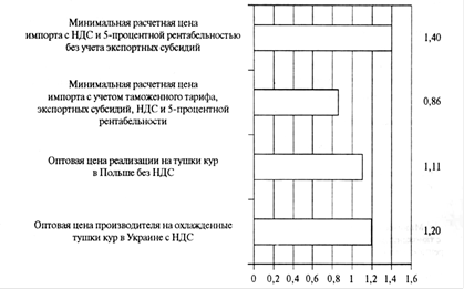 Следовательно, хотя после девальвации гривни в условиях финансового кризиса курятина отечественного производства получила конкурентные преимущества перед импортируемой из ЕС, все же наличие в ЕС экспортных субсидий не позволяет их реализовать. В случае же отмены таких субсидий украинский производитель сможет реализовать свои конкурентные преимущества на этом рынке. Между тем при условии нулевой ставки ввозной пошлины и отмены экспортных субсидий он проиграет ценовую конкуренцию.