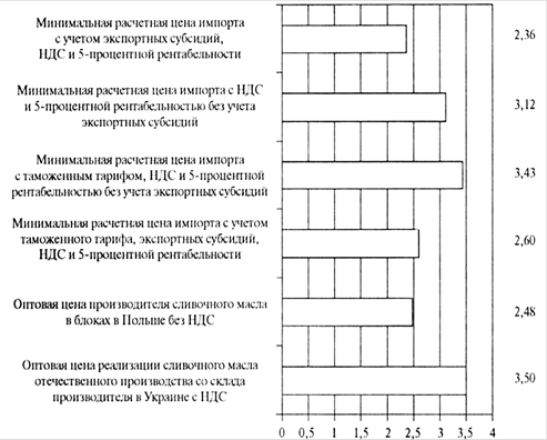 Аналогичные расчеты, произведенные в сентябре 2009 г., показали, что конкурентоспособность польского сливочного масла на рынке Украины поддерживалась за счет экспортных субсидий. Без их учета сливочное масло отечественного производства было бы на 12% дешевле, чем потенциально импортируемое из Польши. Даже при нулевой ставке ввозной пошлины цена отечественного товара могла бы быть на 2% ниже. Однако с сентября 2009 г. по январь 2010 г. сливочное масло в блоках со склада украинского производителя подорожало на 36,5%, тогда как сливочное масло в блоках от польского производителя - на 19,3%.