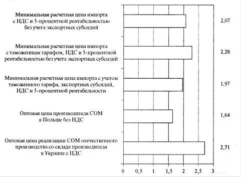 Аналогичные расчеты, проведенные по состоянию на сентябрь 2009 г., показали, что польское СОМ не могло выдерживать ценовую конкуренцию на внутреннем рынке Украины, поскольку минимальная расчетная цена импортируемого СОМ на 5% превышала цену предложения отечественных производителей.10-процентная ставка ввозной пошлины на СОМ выполняла защитную функцию даже в условиях субсидирования экспорта из ЕС. Однако в январе 2010 г., вследствие резкого подорожания СОМ отечественного производства, ситуация изменилась на противоположную - цена продукта украинского производителя стала на 28,2% выше цены потенциального импорта из Польши. Понятно, что от создания ЗСТ конкурентные позиции отечественного СОМ ослабнут: в случае отмены экспортных субсидий оно будет дороже на 16,9%, при нулевой пошлине и при условии сохранения экспортных субсидий - на 23,5%, а при сохранении экспортных субсидий и установлении нулевой ставки пошлины - на 33,7%. Таким образом, оптимальными для отечественных производителей СОМ были бы установление исключения из ЗСТ на СОМ и отмена экспортных субсидий.