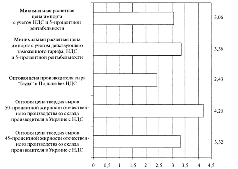 На рисунке 6 приведены результаты расчетов ценовой конкурентоспособности твердых сыров при действующем таможенном тарифе и при условии нулевой ставки пошлины. Аналогичные расчеты по состоянию на сентябрь 2009 г. показали, что по цене твердые сыры украинского производства были бы конкурентоспособны и при нулевой ставке импортной пошлины. Однако вследствие резкого подорожания твердых сыров отечественного производства их цена практически сравнялась с ценой импортируемых польских сыров. Если же в условиях ЗСТ не будет сделано исключение для твердых сыров, то этот продукт украинского производства проиграет ценовую конкуренцию импортируемому (станет на 8% дороже).