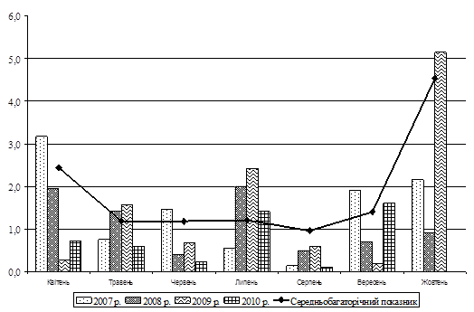 7. Гібриди забезпечили формування врожаю насіння на рівні (1,86-1,91 т/га). Суттєвий недобір врожаю в порівнянні з цими показниками було отримано у сортів Обрій (1,39 т/га), Оксамит 1,39 т/га, Кліф (1,41 т/га), Микитинецький (1,42 т/га).